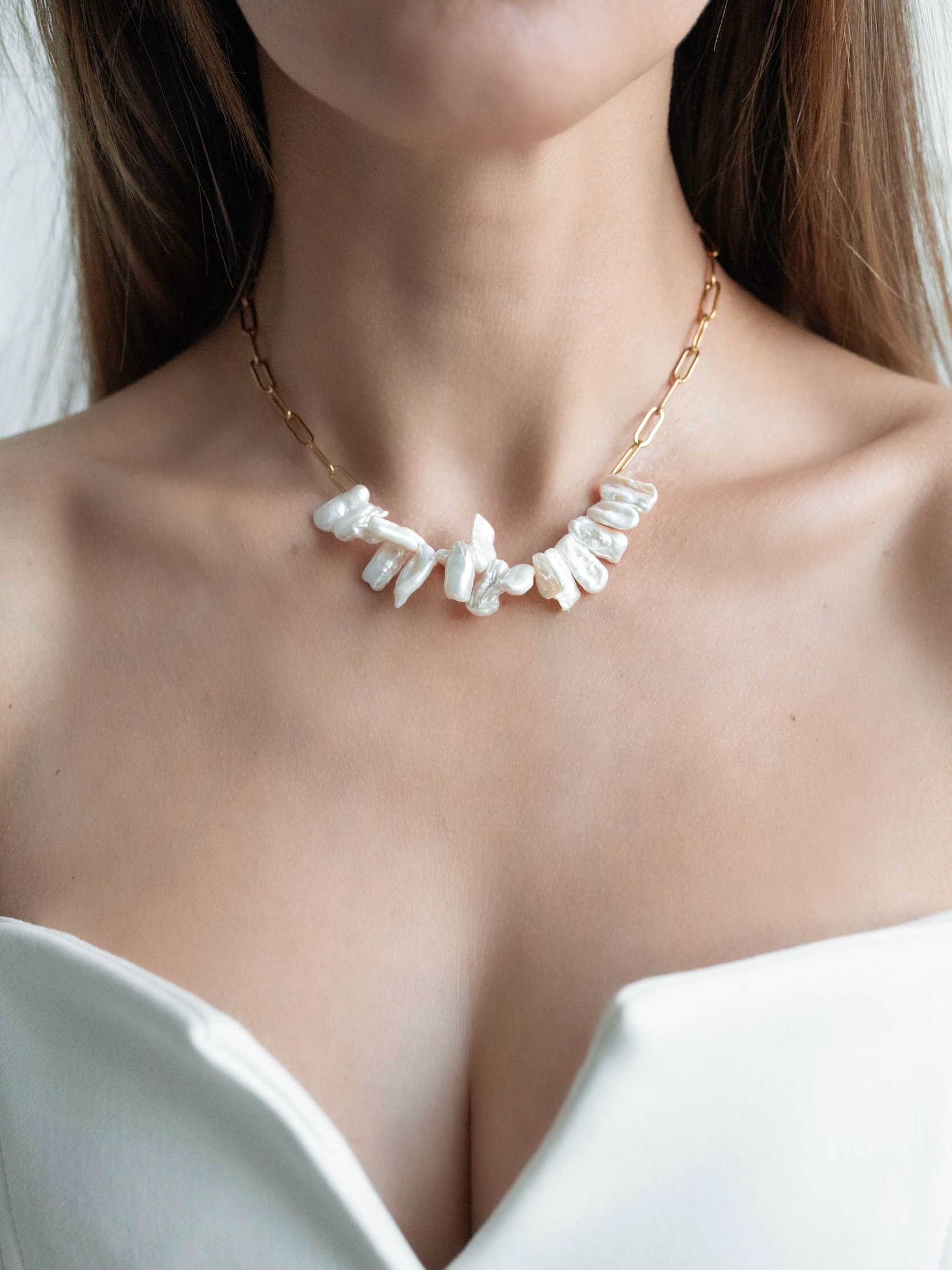 Великолепное колье из прохладного нежного жемчуга. Выглядит необычно за счёт своей формы. Благодаря цвету удачно подходит ко всем нарядам.... Подробнее